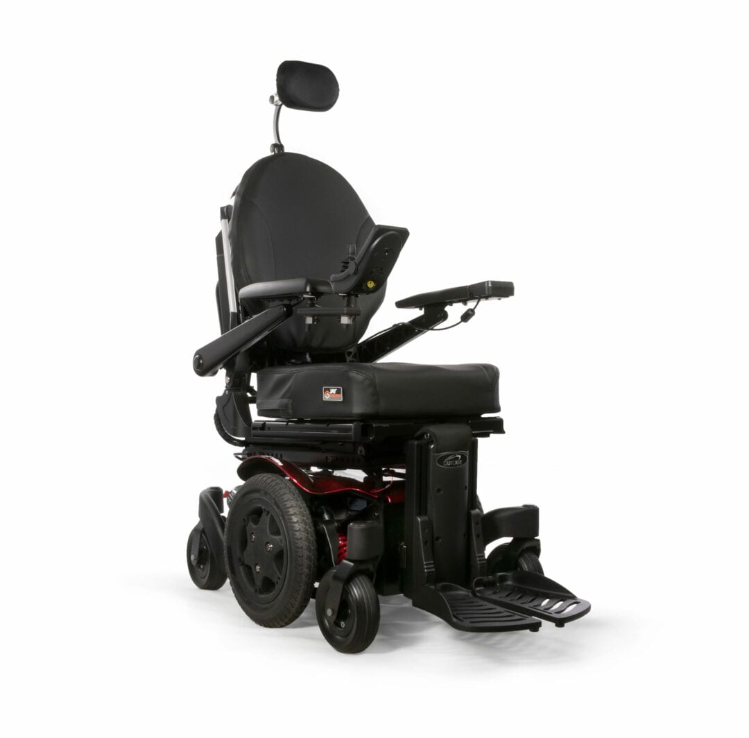 The Quickie Q300 M Mini is the narrowest mid-wheel drive electric wheelchair with 6 mph max speed, 17 miles of range, and 3" curb climbing. Also, the Quickie Q300 M Mini comes with power tilt, seat elevator, power leg functions, and lights. Brand: Sunrise Medical.