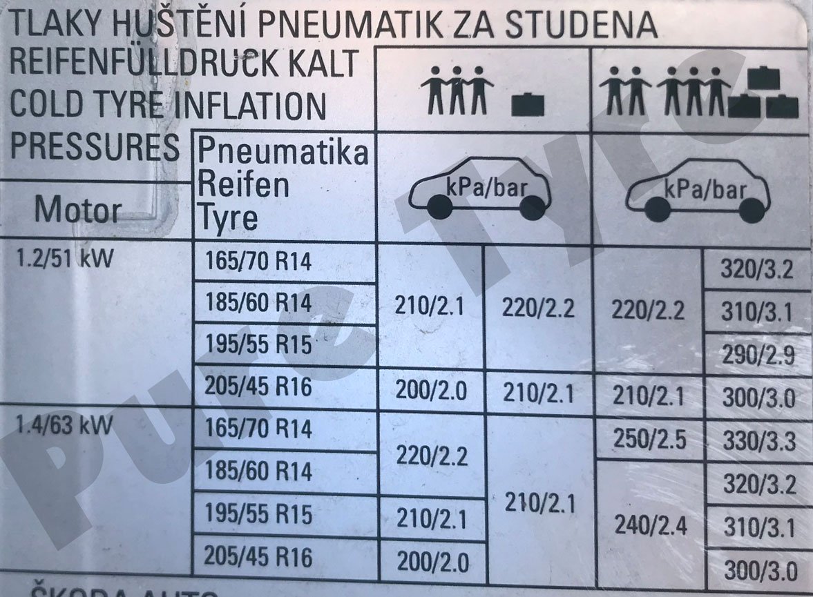 This tyre placard recommends a minimum tyre pressure of 30psi for the Skoda Fabia. This is equal to 210kPa and 2.1bar. See the table below for the comprehensive Skoda Fabia tyre pressure specifications including tyre size, front and back tyre kPa's and specific recommendations based on load weight or number of passengers.